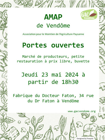 Notre AMAP ouvrira ses portes à toutes les personnes intéressées et curieuses de découvrir notre fonctionnement, nos producteurs et productrices et leurs produits. Cela se passera ce jeudi 23 mai 2024 à la fabrique du Docteur Faton, 34 rue du Dr Faton à Vendôme à partir de 18h30 .